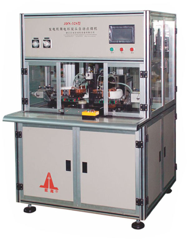 本機(jī)適用于汽車發(fā)電機(jī)轉(zhuǎn)子集電環(huán)與接線頭點(diǎn)焊的一種專用設(shè)備。采用三菱PLC程控,觸摸屏操作,工件自動(dòng)進(jìn)出,自動(dòng)定位,雙電極同時(shí)焊接,放電均勻,配有光電安全保護(hù)開關(guān),使用方便,生產(chǎn)效率高。
